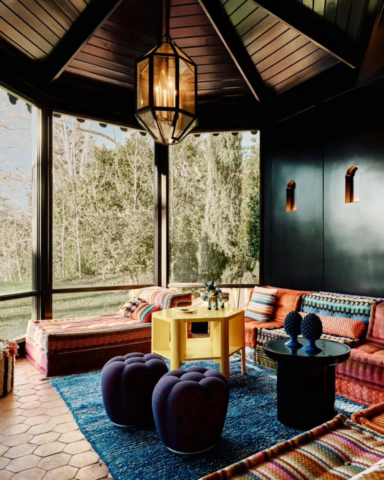 The current owners also converted the pool room into a Moroccan style sitting area. It contains bright colors and bold patterns, something you don't often see in a historic home. The furniture throughout is so handfully selected. The dining room area for example is so vintage and chic but it just works with everything else. The lounge area as well includes an ornate fireplace with furniture that helps modernize it.