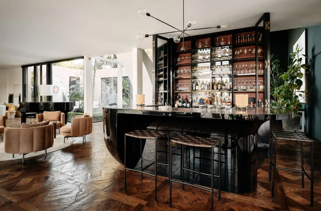Aside from redoing the layout of the house the new owners also added a new smart-home system. It is so interesting to see how you can modernize a home while salvaging the history at the same time. The design done is just impeccable, the bar design itself is enough to speak volumes with its lacquered fiberglass finish. The stools are the perfect touch. You can see the flooring is so historic but the bar adds such a modern touch.